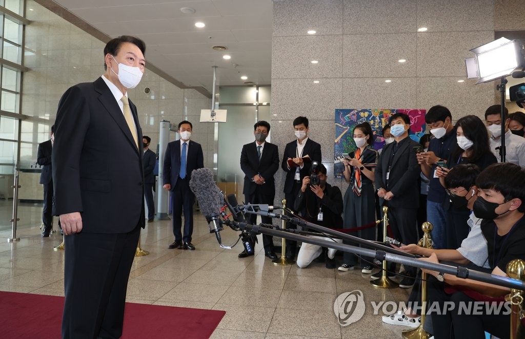 | ▲ President Yoon Suk-yeol takes reporters' questions as he arrives at the presidential office in Seoul on Sept. 2, 2022. (Yonhap) |