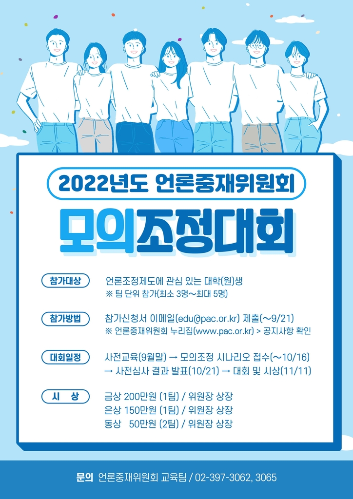 모의조정대회는 언론조정제도에 관심있는 대학생이나 대학원생이면 누구나 팀(3∼5명)을 이뤄 참여할 수 있다. 올해 대회 참가접수는 9월 1∼21일이다.