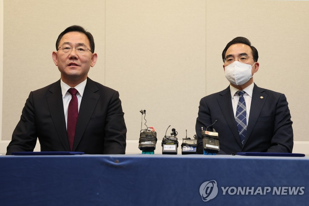 | ▲ Rep. Joo Ho-young (L) and Rep. Park Hong-geun, floor leaders of the ruling People Power Party and the main opposition Democratic Party, hold a joint press conference to announce an agreement to carry out a parliamentary probe into Itaewon tragedy at the National Assembly in western Seoul on Nov. 23, 2022. (Yonhap) |