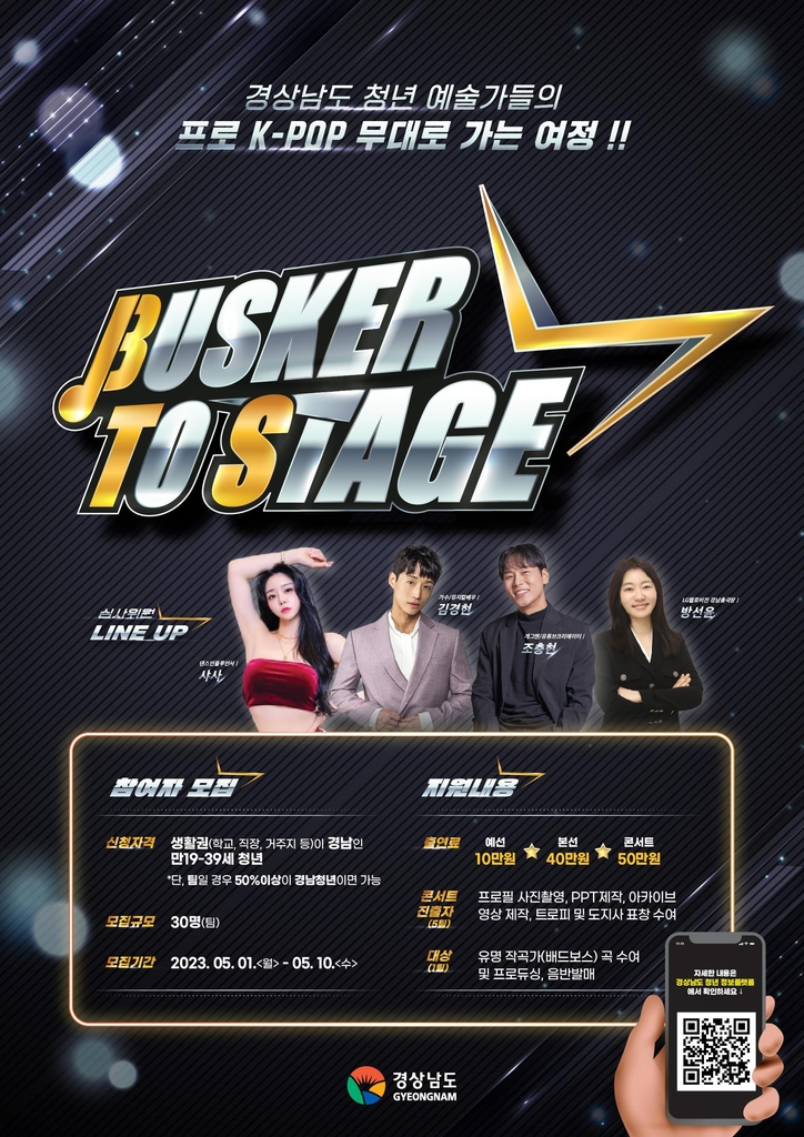 (창원=연합뉴스) 황봉규 기자 = 경남도는 세계적 인기그룹인 방탄소년탄(BTS)에 착안해 '경남의 BTS'를 찾는 '청년 거리문화 페스티벌' 참가자를 모집한다고 2일 밝혔다.