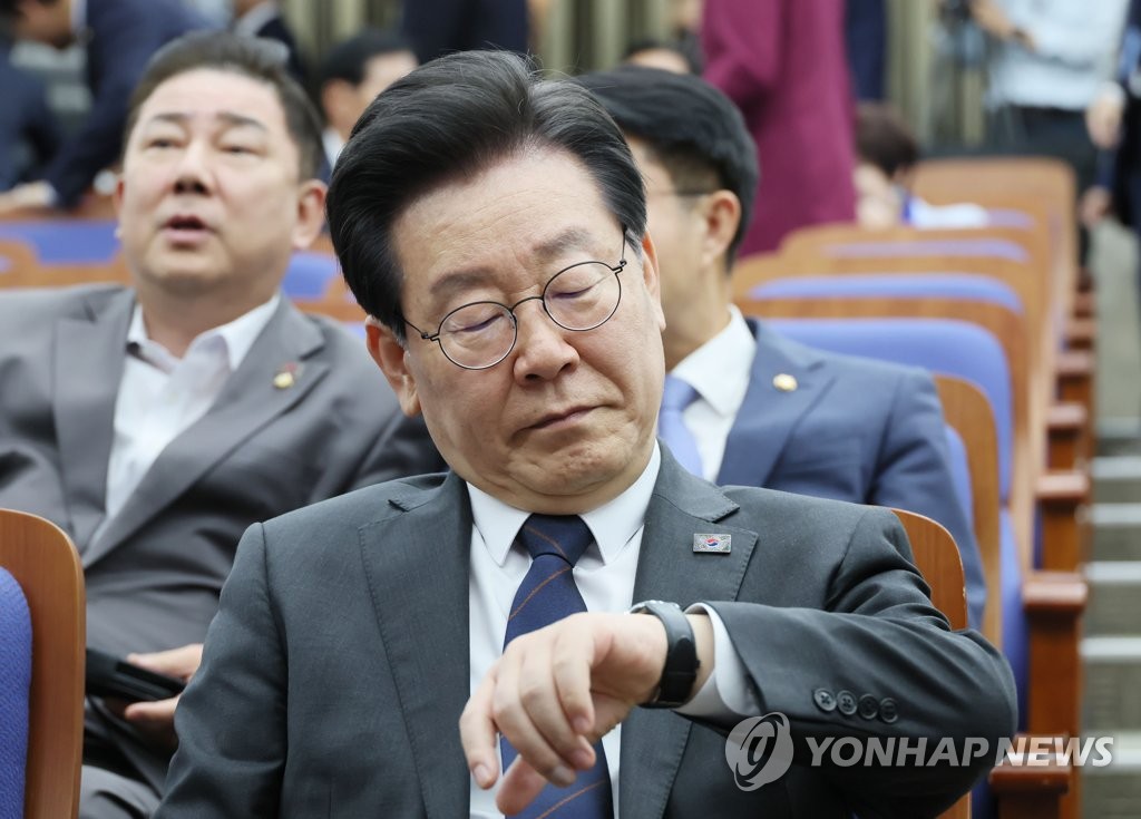 | ▲ Main opposition Democratic Party leader Lee Jae-myung checks the time on his watch at the National Assembly in Seoul on May 25, 2023. (Yonhap) |
