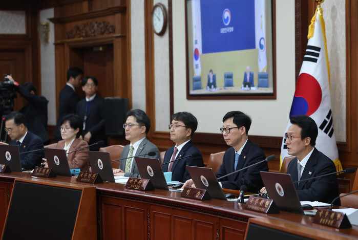 Prime Minister Kim Min-seok (far R) speaks during a Cabinet meeting at the government complex in Seoul on Nov. 18, 2025. (Yonhap)