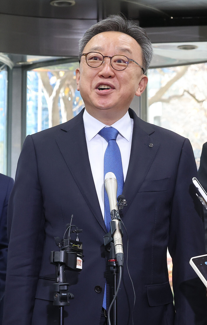 Shinhan Bank head Jeong Sang-hyeok, also one of the four candidates for Shinhan Financial Group's next leader, speaks to reporters upon arrival at its headquarters in Seoul on Dec. 4, 2025, to attend the last individual interview for the post. (Yonhap)