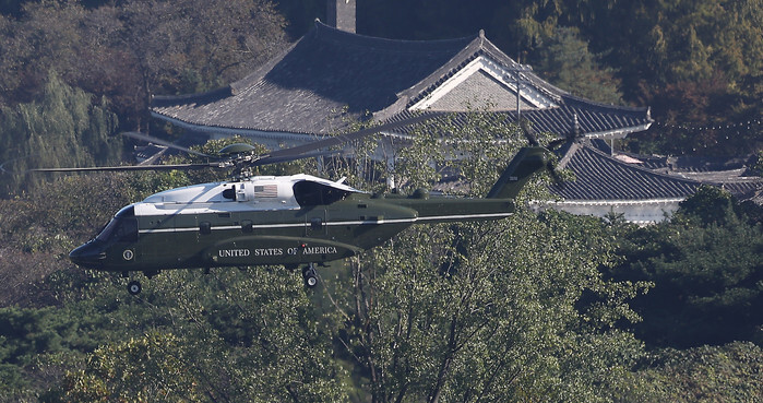 Marine One carrying U.S. President Donald Trump takes off from a heliport in Gyeongju, North Gyeongsang Province, southeastern South Korea, on Oct. 30, 2025, as he travels to the nearby city of Busan to hold talks with Chinese President Xi Jinping later in the day. (Yonhap)