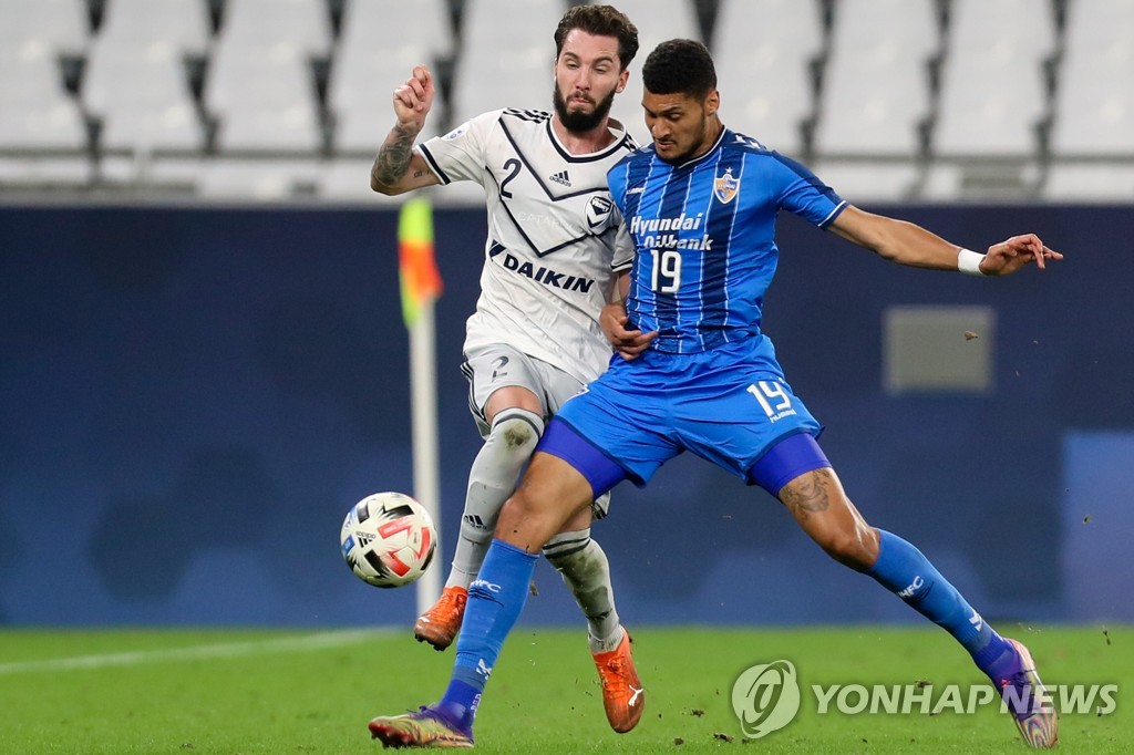 ▲ In this AFP file photo from Dec. 6, 2020, Bjorn Johnsen of Ulsan Hyundai FC (R) battles Storm Roux of Melbourne Victory for the ball during the teams' round of 16 match at the Asian Football Confederation Champions League at Education City Stadium in Al Rayyan, Qatar. (Yonhap)