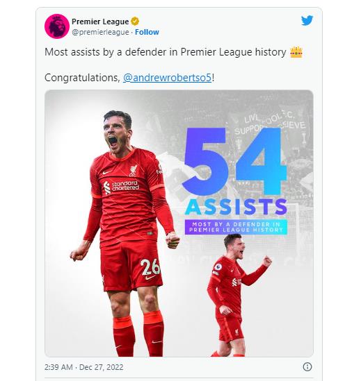로버트슨은 통산 54도움으로 EPL 수비수 중 역대 1위 올라