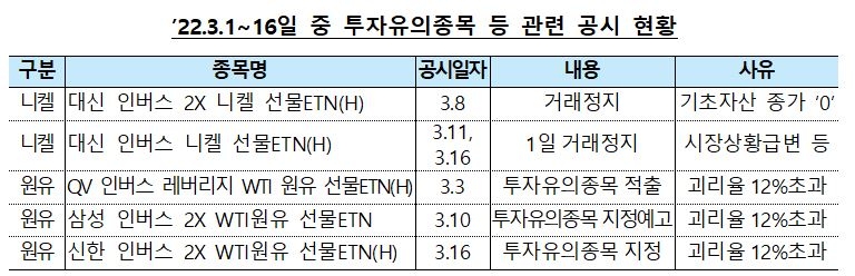 '신한 인버스 2X WTI원유선물 ETN(H)' 등 일부는 투자유의 종목으로 지정됐다.