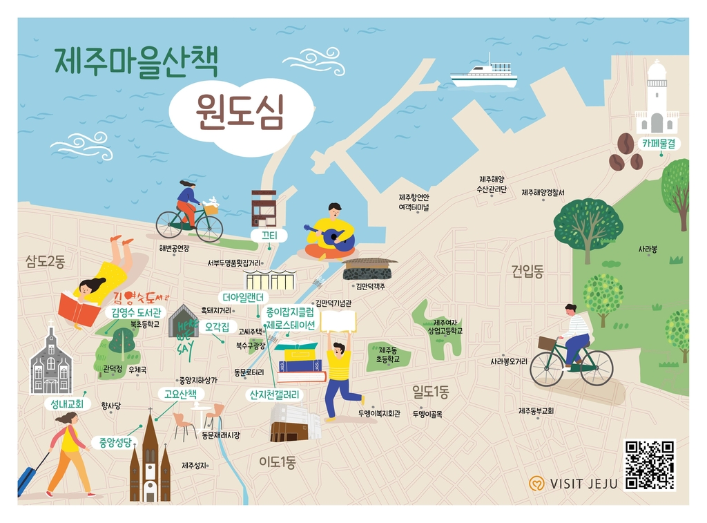 제주마을산책 원도심편은 비짓제주(www.visitjeju.net)에서 만나볼 수 있으며, 하편에 소개된 장소에 방문하면 원도심 일러스트 지도와 스티커를 선착순 100명에게 증정하고 있다.