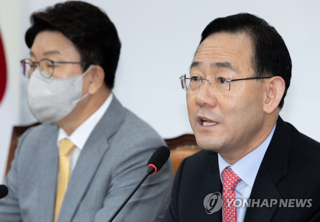 | ▲ The ruling People Power Party's interim leader Joo Ho-young (R) speaks during an emergency leadership meeting held at the National Assembly in western Seoul on Aug. 18, 2022. (Pool photo) (Yonhap) |