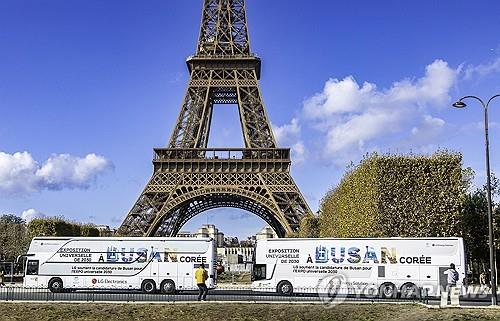 ▲ This undated file photo, provided by LG Electronics, shows buses, covered with logos promoting South Korea's bid to host the 2030 World Expo in the southeastern port city of Busan, driving past the Eiffel Tower in Paris. (PHOTO NOT FOR SALE) (Yonhap)