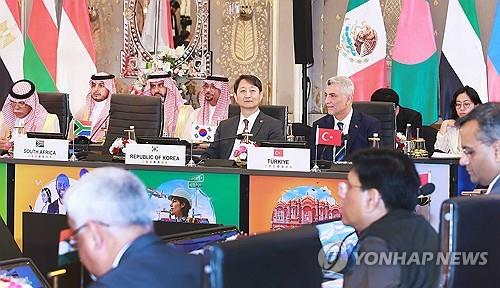 | ▲ This photo, provided by South Korea's industry ministry, shows Trade Minister Ahn Duk-geun (C) taking part in the two-day Group of 20 Trade and Investment Ministerial Meeting that began on Aug. 24, 2023 in the Indian city of Jaipur. (PHOTO NOT FOR SALE) (Yonhap) |