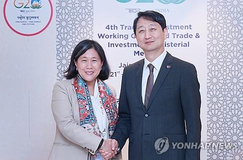 | ▲ This photo, provided by South Korea's industry ministry, shows Trade Minister Ahn Duk-geun (R) shaking hands with U.S. Trade Representative Katherine Tai ahead of their talks in Jaipur, India, on Aug. 24, 2023. (PHOTO NOT FOR SALE) (Yonhap) |