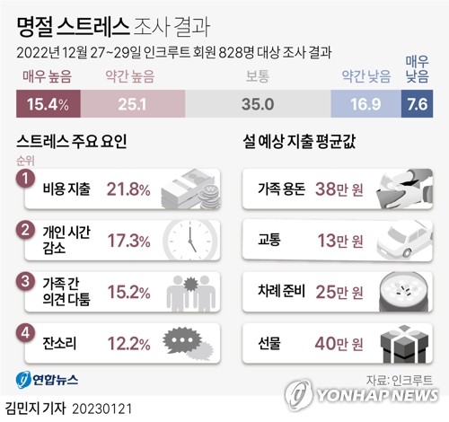 (서울=연합뉴스) 김아람 기자 = 고물가 시대를 맞아 '명절 비용 지출' 부담으로 스트레스를 받는 이들이 상당히 많다는 조사결과가 나왔다.