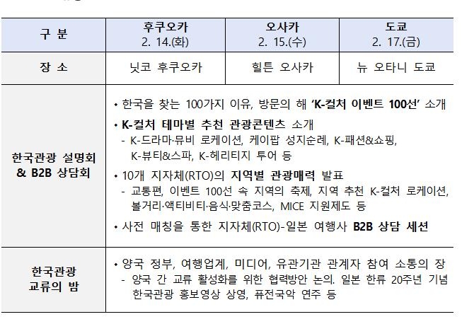 일본 K관광 로드쇼는 기업 간 거래(B2B) 중심의 2월 행사와 기업·소비자 거래(B2C) 중심의 4월 행사로 나누어 진행된다.