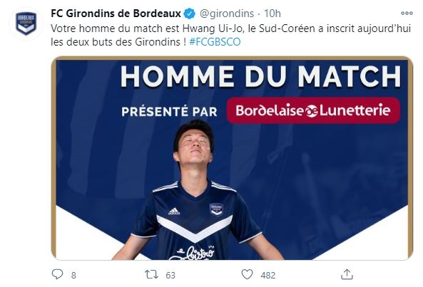 | ▲ 앙제전 최우수선수로 뽑힌 황의조 [지롱댕 보르도 구단 트위터 캡처. 재판매 및 DB 금지] |