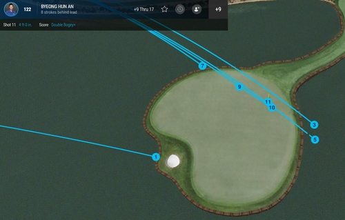 이날 143야드로 세팅된 17번 홀에서 안병훈은 티샷이 물에 빠진 뒤 드롭 존에서도 세 차례나 더 물에 빠뜨리고 말았다. 그린에 몇 차례 튄 뒤 빠진 공도 있었고, 안착하는 듯하다가 미끄러져 내려 물속으로 향한 공도 있었다.
