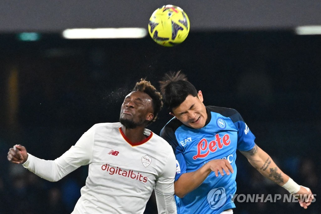 (서울=연합뉴스) 이의진 기자 = 이탈리아 프로축구 세리에A 선두 나폴리의 후방을 지키는 '괴물 수비수' 김민재(27)가 이번에는 AS 로마의 공격진을 꽁꽁 묶었다.