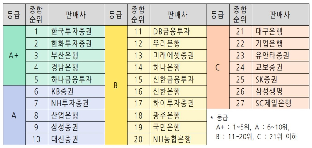 또 한화투자증권[003530](2위), 부산은행(3위), 경남은행(4위), 하나금융투자(5위)가 5위 이상 'A+' 등급을 받았다. 특히 한화투자증권은 'A+' 등급을 2018년부터 4년 연속 유지했다.