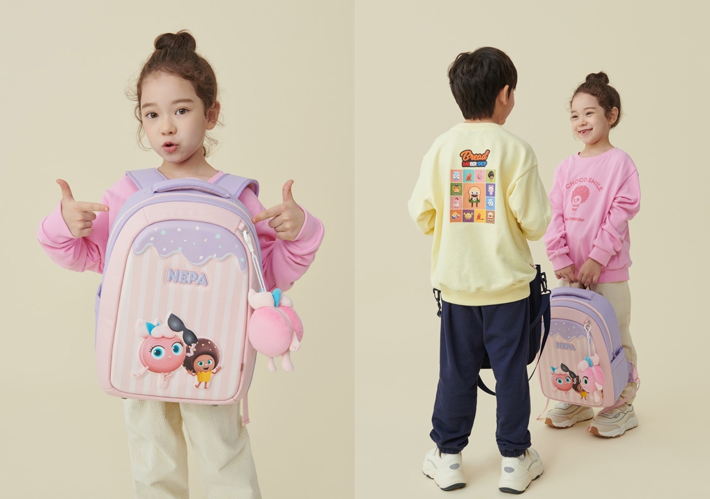 네파 키즈는 인기 애니메이션 '브레드이발소'와 협업한 책가방을 선보인다.