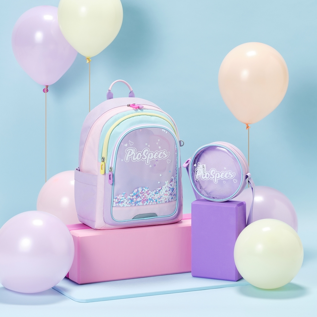 프로스펙스는 투명한 전면에 움직이는 비즈를 가득 넣은 책가방을 출시했다.
