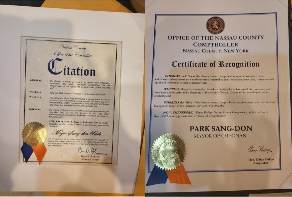 미 뉴욕 나소카운티, 박상돈 천안시장에 감사장 수여