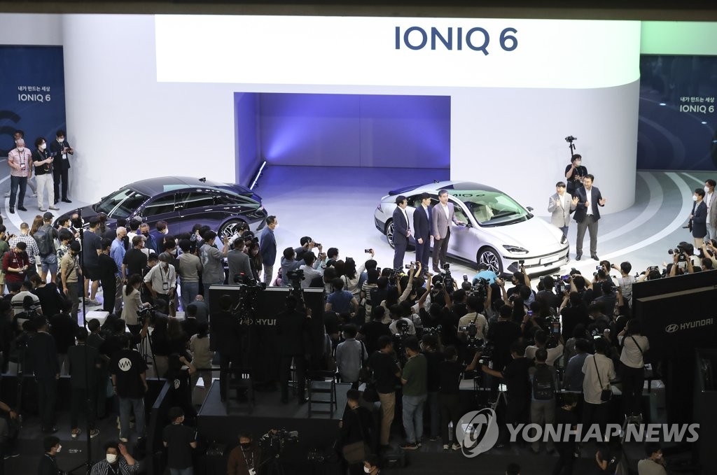 ▲ 부산국제모터쇼 아이오닉 6 세계 최초 공개 (부산=연합뉴스) 강덕철 기자 = 14일 부산 해운대구 벡스코에서 열린 '2022 부산국제모터쇼' 프레스데이 행사에서 현대차가 '아이오닉 6'을 세계 최초로 공개하고 있다. 2022.7.14 kangdcc@yna.co.kr