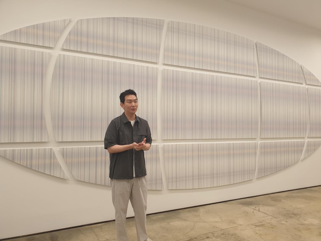 | ▲ (서울=연합뉴스) 황희경 기자 = 지근욱 작가가 9일 서울 소격동 학고재 신관에서 전시작 '교차-형태(복사)'를 소개하는 모습. 2023.8.10.zitrone@yna.co.kr |