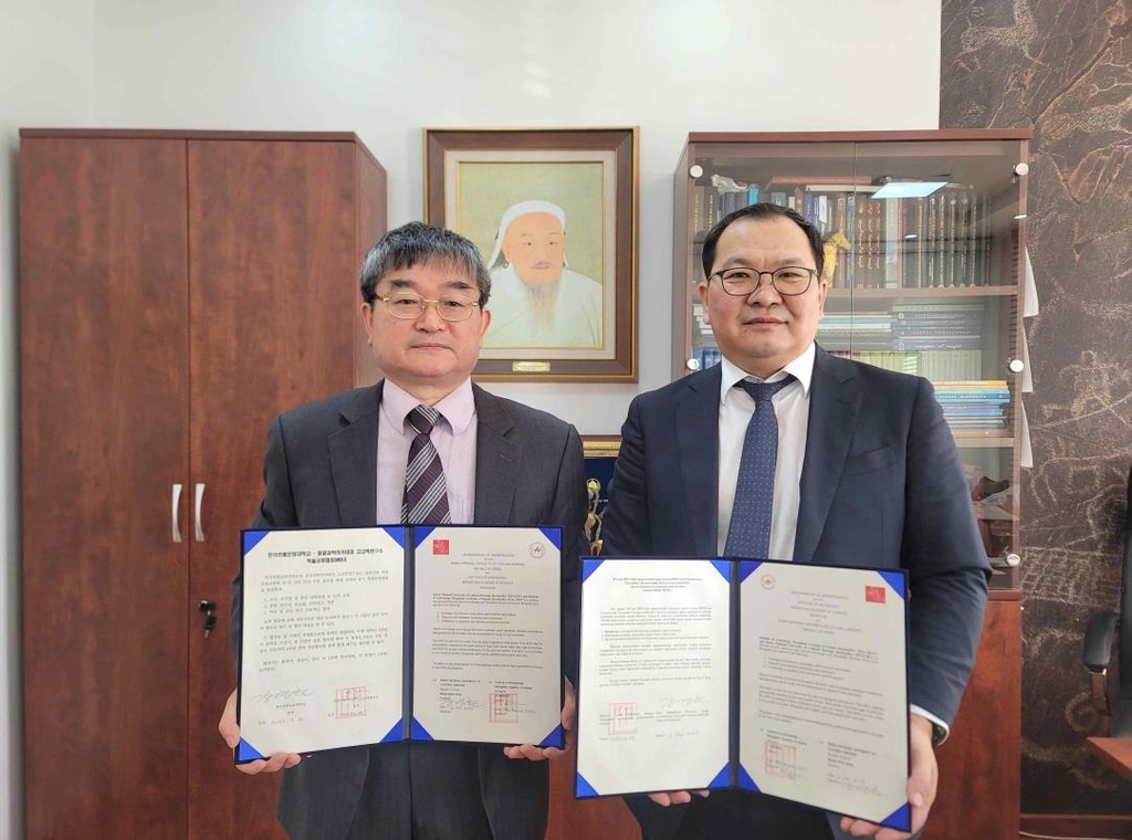 | ▲ 한국전통문화대-몽골과학아카데미 고고학연구소 업무협약 왼쪽부터 정석배 한국전통문화대 융합고고학과 교수, 에렉젠 몽골과학아카데미 고고학연구소장 [한국전통문화대 제공. 재판매 및 DB 금지] |