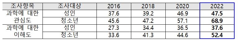 조사 결과에 따르면 과학에 대한 관심도는 성인이 47.5점, 청소년이 68.9점으로 2020년 성인 46.9점, 청소년 57.1점에 비해 상승했다.