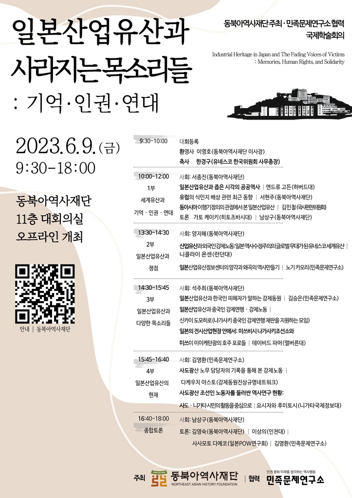 이밖에 김승은 민족문제연구소 책임연구원이 한국인 피해자의 목소리를 통해 본 일본산업유산 문제를, 호주 멜버른대 데이비드 파머 명예연구원이 아시아태평양전쟁기 미쓰비시 나가사키 조선소와 미쓰이 미이케 탄광에서의 호주 포로 강제 노동실태 등을 소개한다.