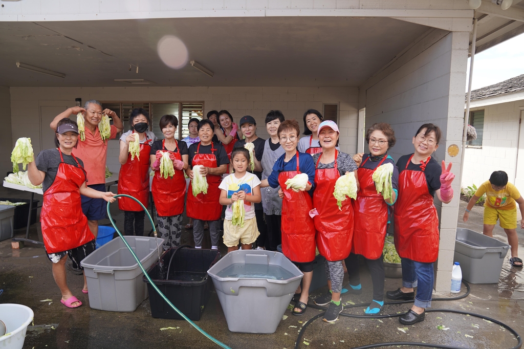 | ▲ 최은진 전 한인회장(앞줄 맨 오른쪽)과 김장 담그는 마우이 한인들 [최은진 전 회장 제공] |