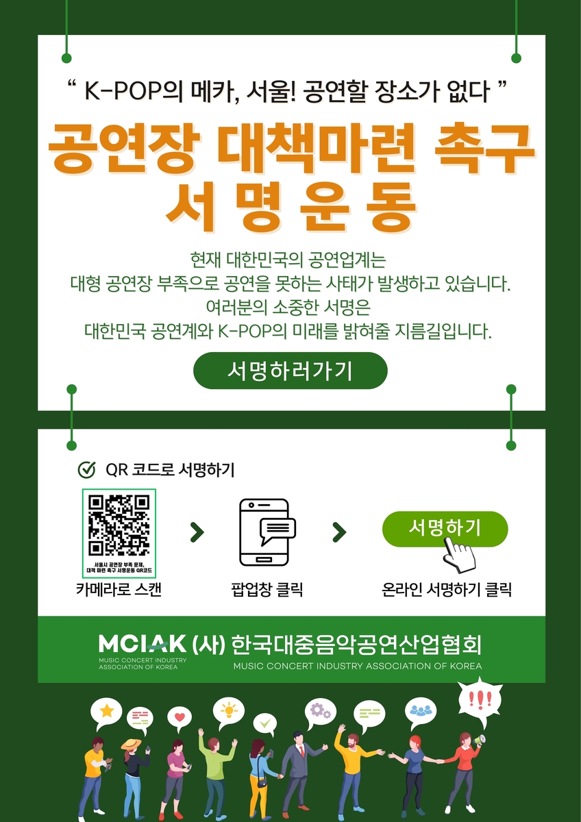 음공협은 이번 서명운동으로 정부와 서울시에 대중음악 공연을 진행할 수 있는 임시 공연장을 수도권에 마련하고, 정부·서울시·체육업계·문화계가 함께하는 통합협의체(TF)를 구성하는 등 공연장 부족 현상을 타개할 대책을 요구한다.