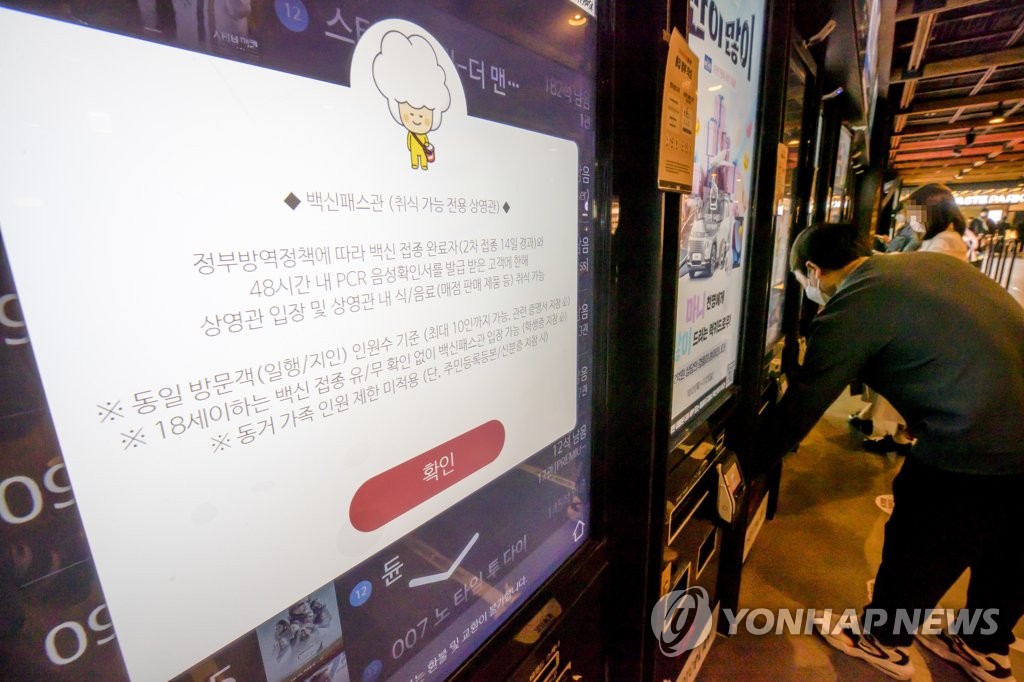 Leading multiplex chains CJ CGV and Lotte Cinema said they are running "vaccine pass" theaters for fully vaccinated people, where they do not have to sit at a certain distance and can have popcorn and sodas while viewing films.