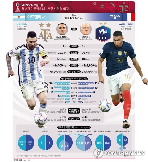 | ▲ [그래픽] 2022 카타르 월드컵 결승전 아르헨티나 - 프랑스 전력 비교 (서울=연합뉴스) 김영은 기자 = 아르헨티나와 프랑스는 한국시간으로 19일 0시 카타르 도하의 루사일 스타디움에서 2022 국제축구연맹(FIFA) 카타르 월드컵 결승전을 치른다. 0eun@yna.co.kr 트위터 @yonhap_graphics 페이스북 tuney.kr/LeYN1 |