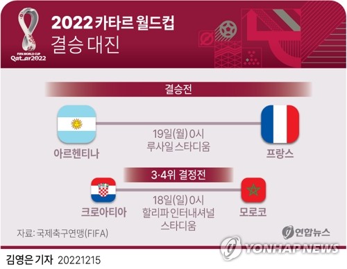 | ▲ [그래픽] 2022 카타르 월드컵 결승 대진 (서울=연합뉴스) 김토일 기자 = 2022 카타르 월드컵에서 아르헨티나와 프랑스가 19일(한국시간) 0시 루사일 스타디움에서 우승 트로피를 놓고 다툰다. 모로코와 크로아티아의 3, 4위 결정전은 18일 0시 도하의 할리파 인터내셔널 스타디움에서 킥오프한다. kmtoil@yna.co.kr 페이스북 tuney.kr/LeYN1 트위터 @yonhap_graphics |