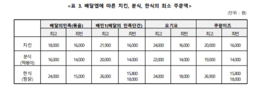 ▲ 배달앱에 따른 치킨, 분식, 한식의 최소 주문액 [한국소비자단체협의회 제공. 재판매 및 DB 금지]