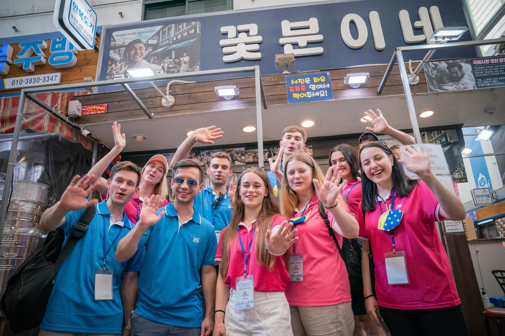 | ▲ 부산 국제시장을 돌아보고 기념 촬영한 우크라이나 댄스팀 '므리야' 단원들 [IYF 제공] |