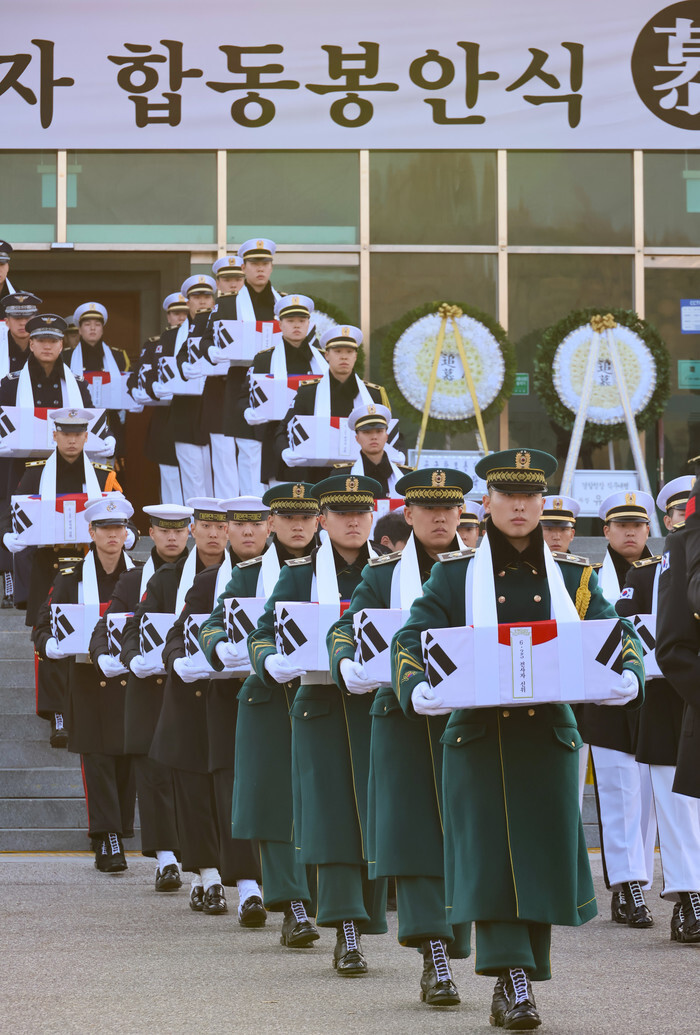 An honor guard of the Army carries South Korean flag-draped boxes containing the excavated remains of South Korean soldiers killed during the 1950-53 Korean War during a joint enshrinement ceremony at the National Cemetery in Seoul on Dec. 15, 2025. (Yonhap)
