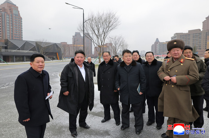 In this Korean Central News Agency photo published on Jan. 11, 2026, North Korean leader Kim Jong-un (2nd from L) inspects the construction of 10,000 housing units in Pyongyang's Hwasong district the previous day. The news agency said the construction had reached 99 percent completion and was in its final stage. (For Use Only in the Republic of Korea. No Redistribution) (Yonhap)