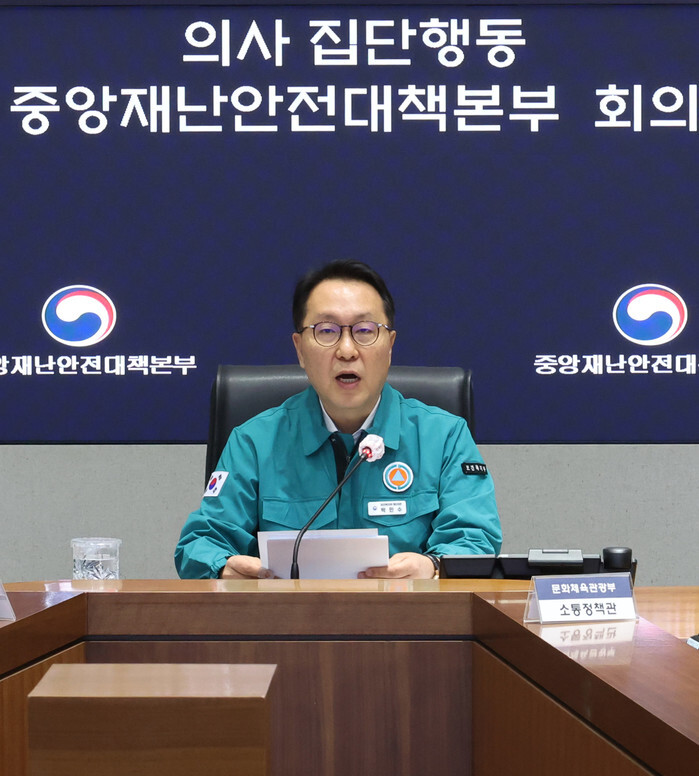 Second Vice Health Minister Park Min-soo attends a meeting of the Central Disaster and Safety Countermeasures Headquarters at the government complex in Seoul on Feb. 28, 2025, about measures to deal with a prolonged walkout by trainee doctors. Thousands of trainee doctors have been absent from their workplaces in the form of mass resignations amid the lingering deadlock with the government over a controversial medical reform plan since February 2024. (Yonhap)