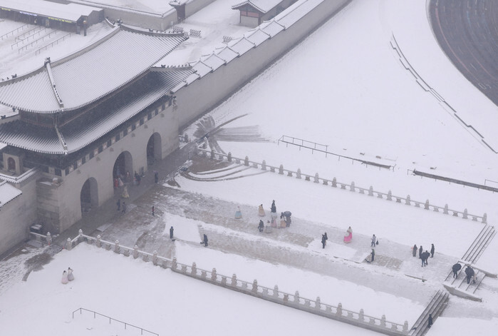 Officials clear snow at Gyeongbok Palace in central Seoul on Jan. 5, 2025. (Yonhap)