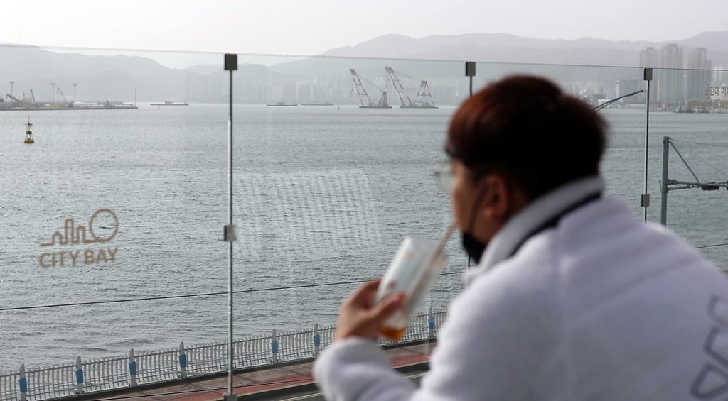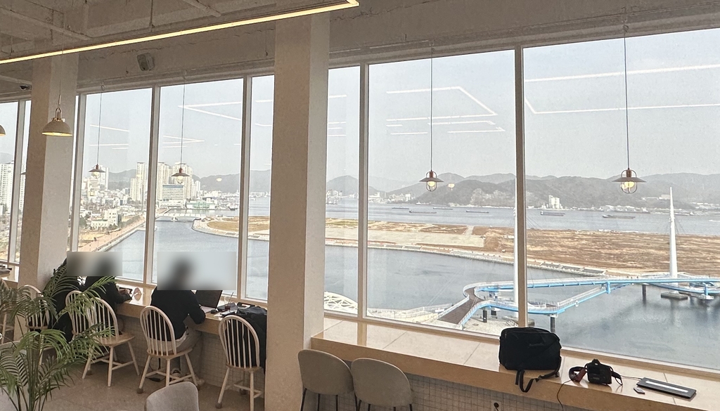 | ▲ 바다가 보이는 카페 (창원=연합뉴스) 김동민 기자 = 지난 13일 경남 창원시 마산회원구 한 4층 규모 베이커리 카페에서 시민이 바다를 보며 음료를 마시고 있다. 2022.12.14 |