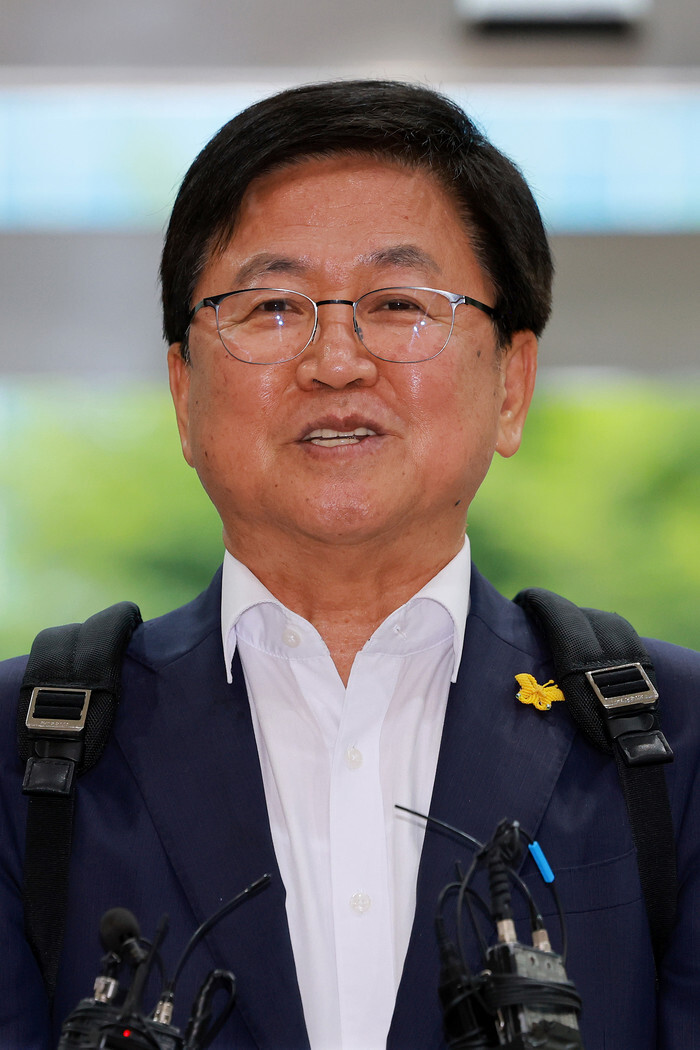 Choi Kyo-jin, nominated by President Lee Jae Myung as the education minister and the deputy prime minister for social affairs, speaks to reporters as he arrives at his temporary office in Seoul on Aug. 14, 2025, to prepare for his parliamentary confirmation hearing. (Yonhap)