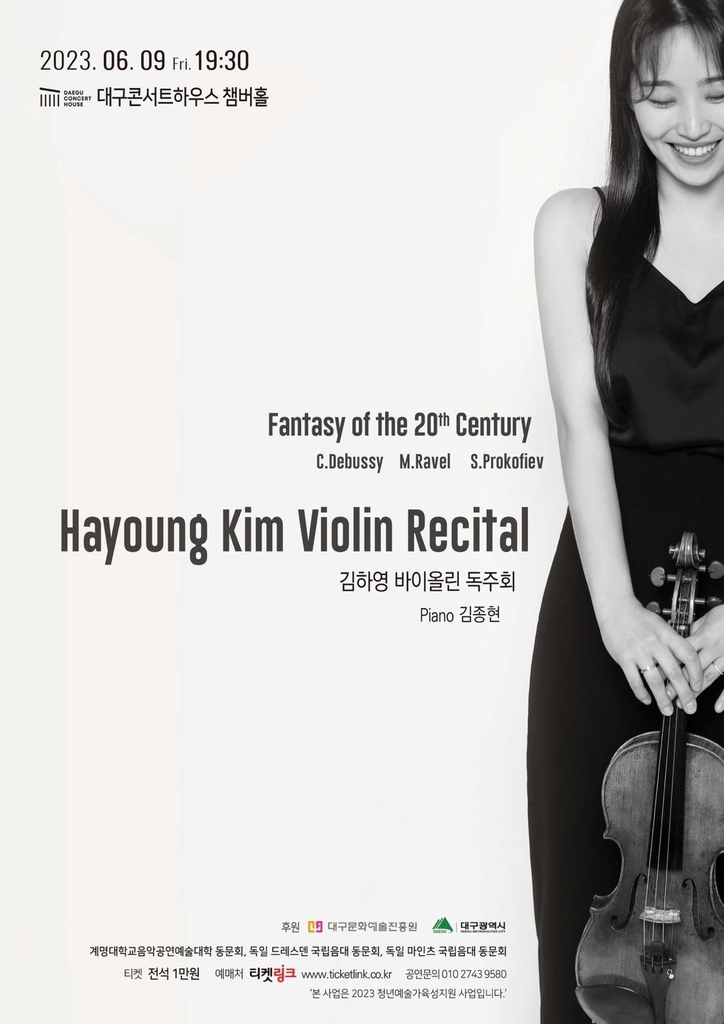 ▲ 대구문화예술진흥원은 오는 9일 오후 7시 30분 대구콘서트하우스 챔버홀에서 바이올리니스트 김하영 독주회를 개최한다고 2일 밝혔다. 독주회에선 드뷔시, 라벨, 프로코피예프의 곡을 들려준다. 대구문화예술진흥원은 만 35세 이하 청년 예술가를 발굴해 지원하는 사업을 추진하고 있다. (대구=연합뉴스)