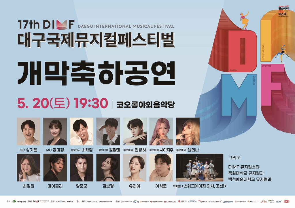 (대구=연합뉴스) 류성무 기자 = 제17회 대구국제뮤지컬페스티벌(이하 DIMF, 5.19∼6.5일) 개막 축하공연이 오는 20일 오후 7시 30분 대구 달서구 코오롱야외음악당에서 열린다.