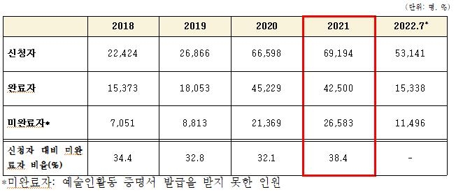 | ▲ 최근 5년간 예술인활동증명 신청자 및 완료자, 미완료자 현황 [임종성 의원실 제공] |