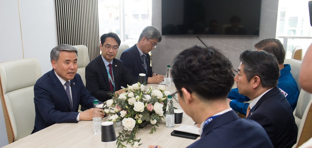 SEOUL, May 24 (Yonhap) -- Defense Minister Lee Jong-sup has reaffirmed government support for arms exports in a meeting with officials from South Korean defense companies participating in a maritime and aerospace exhibition in Malaysia, his ministry said Wednesday.