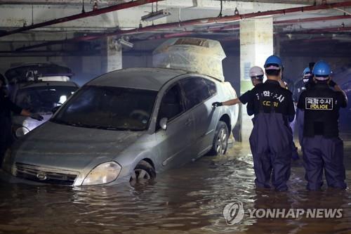 | ▲ This undated file photo shows investigators examining an underground parking lot in an apartment complex in Pohang, 262 kilometers south of Seoul, submerged after Typhoon Hinnamnor struck the country in September 2022. (Yonhap) |