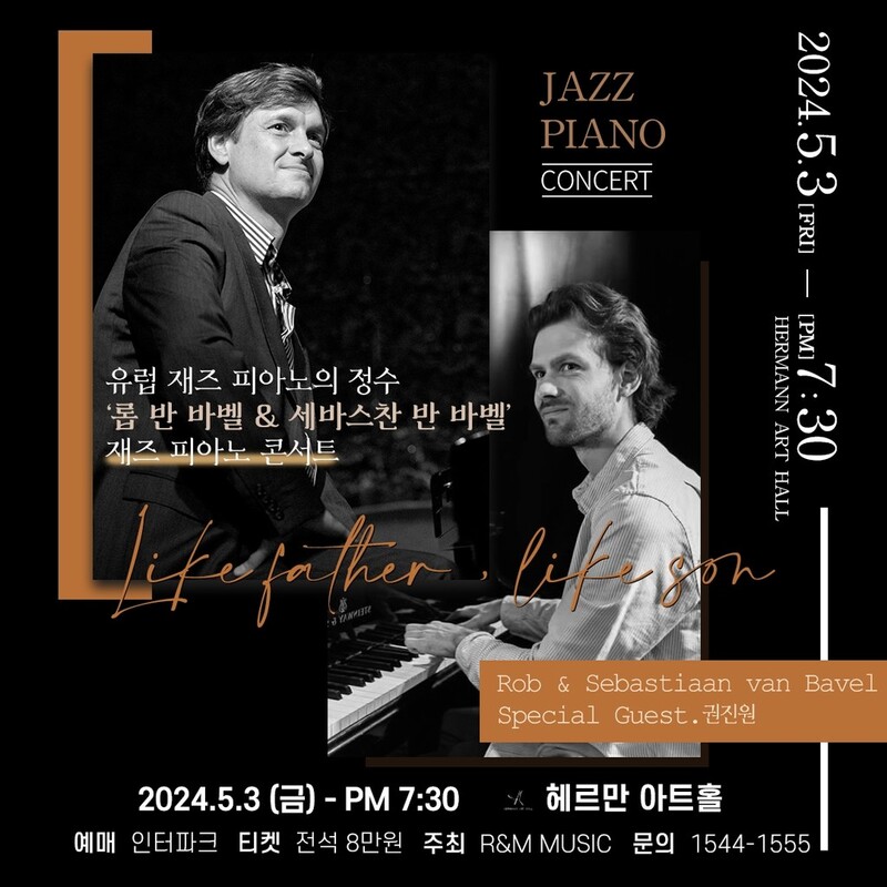'롭 앤드 세바스찬 반 바벨 재즈 피아노 콘서트'(Rob & Sebastiaan van Bavel Jazz piano concert)라는 이름으로 열리는 이번 공연은 한 대의 피아노에서 바벨 부자 두 사람이 연주하는 특별한 형식으로 진행된다.