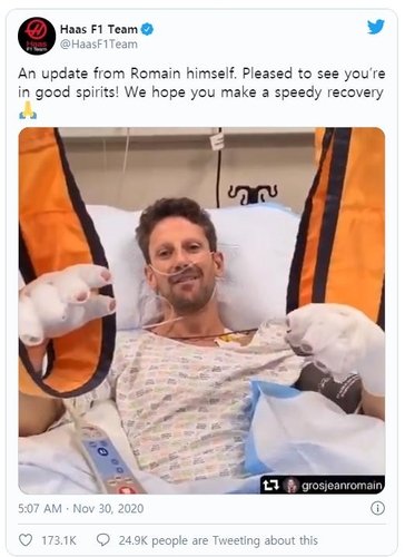 | ▲ 병원으로 옮겨진 뒤 웃으며 자신의 상태를 전하는 로맹 그로장. [하스 F1팀 트위터 캡처. 재판매 및 DB 금지] |